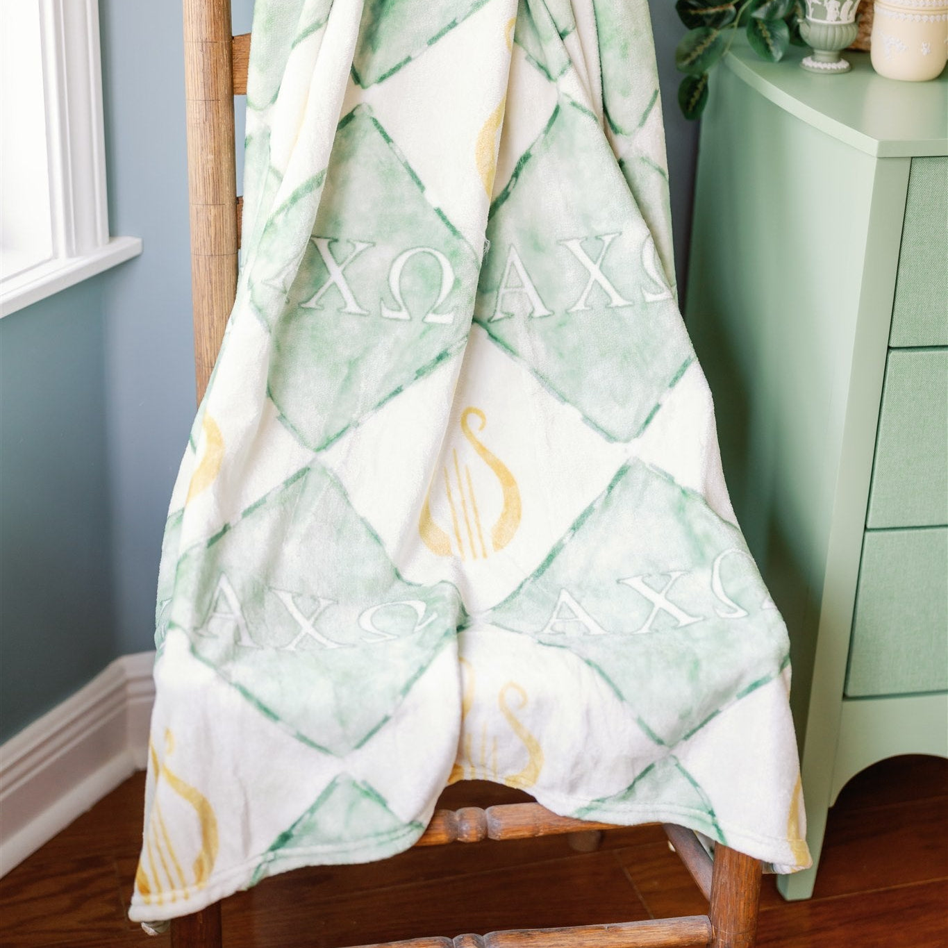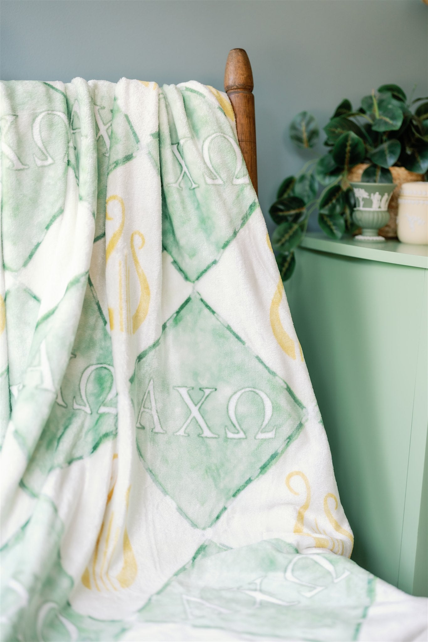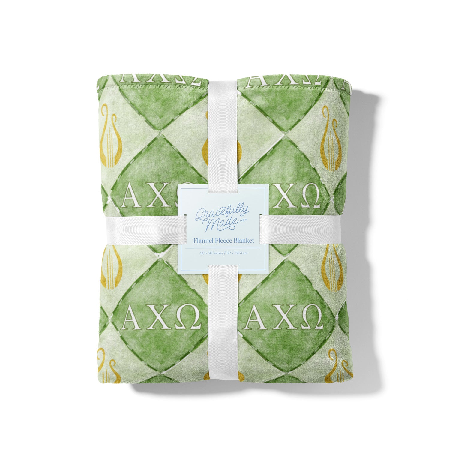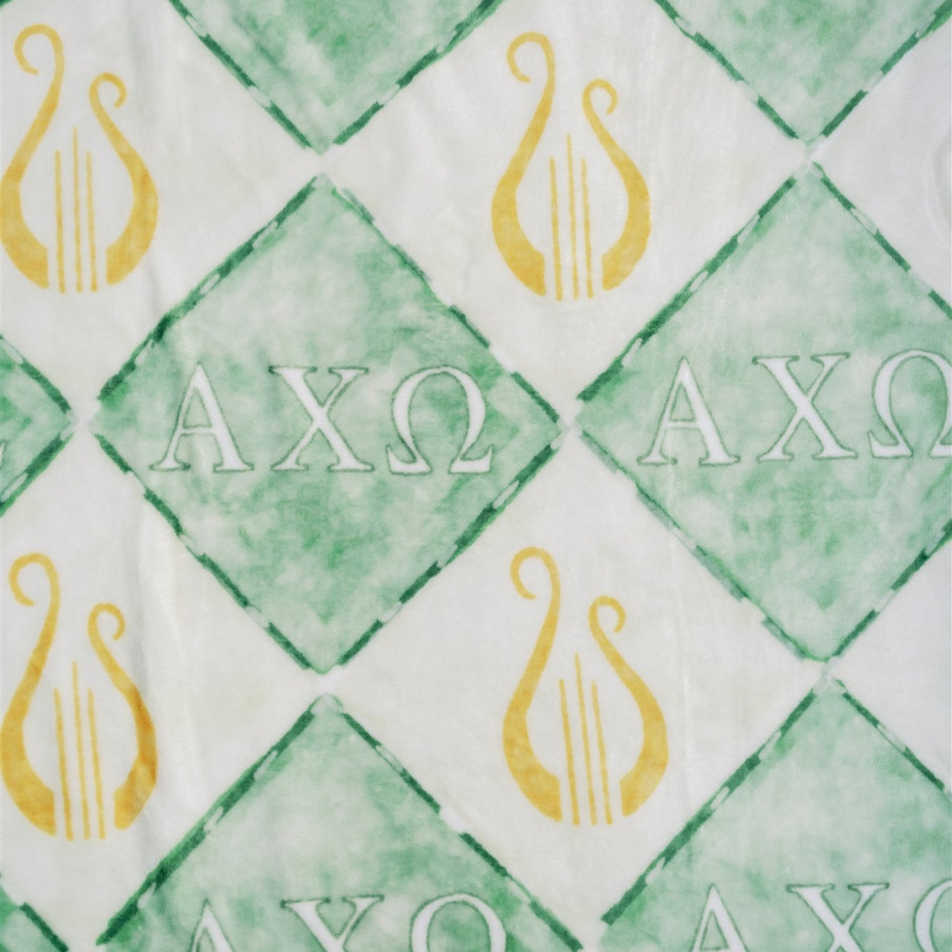 Celebrate your symphony of sisterhood with our Alpha Chi Omega fleece blanket! This 50x60 inch throw features a hand-painted diamond design in shades of green, adorned with golden lyres and the Alpha Chi Omega Greek letters. It’s a soft, stylish, and meaningful gift—perfect for cozy nights, dorm room décor, or showing your AXO pride all year long.