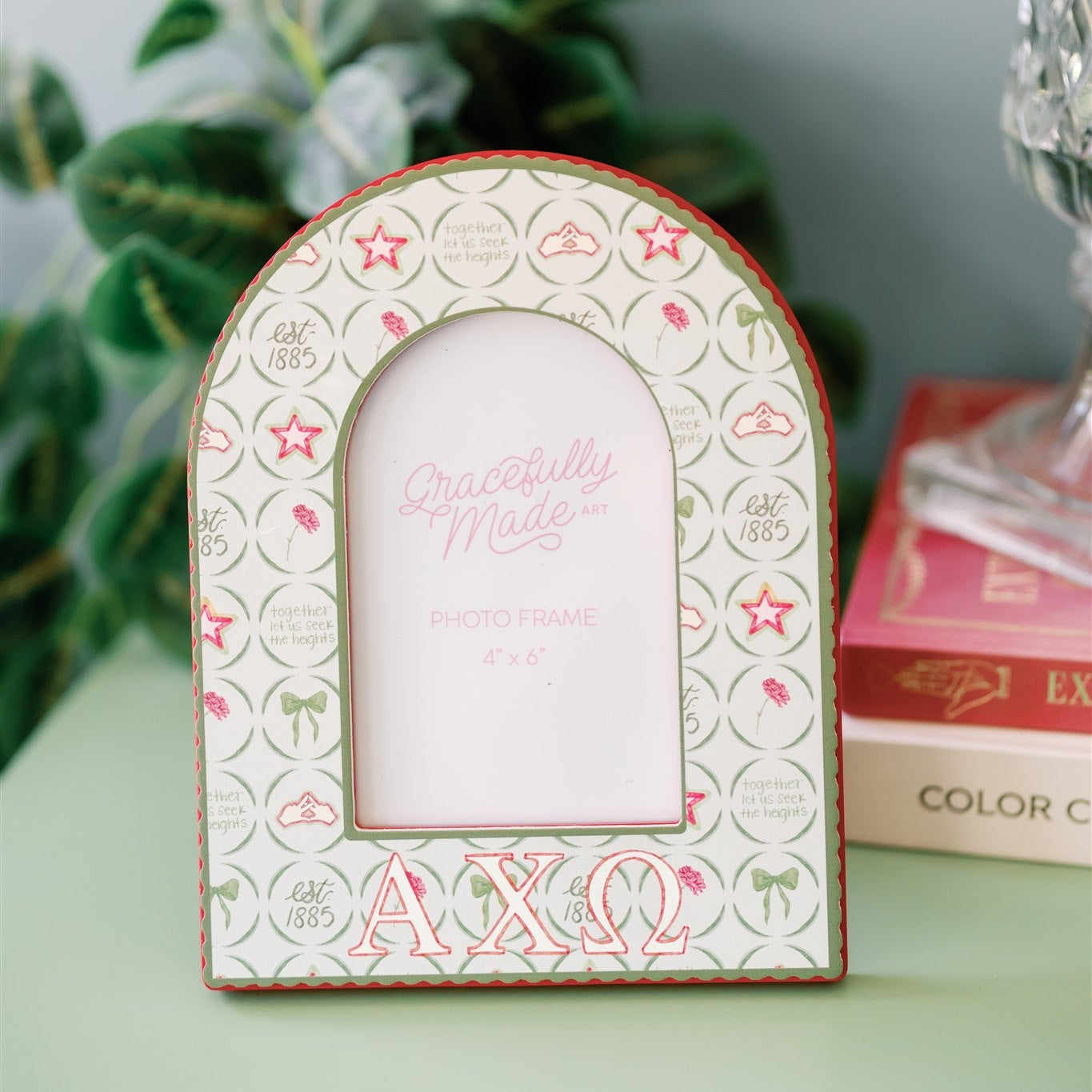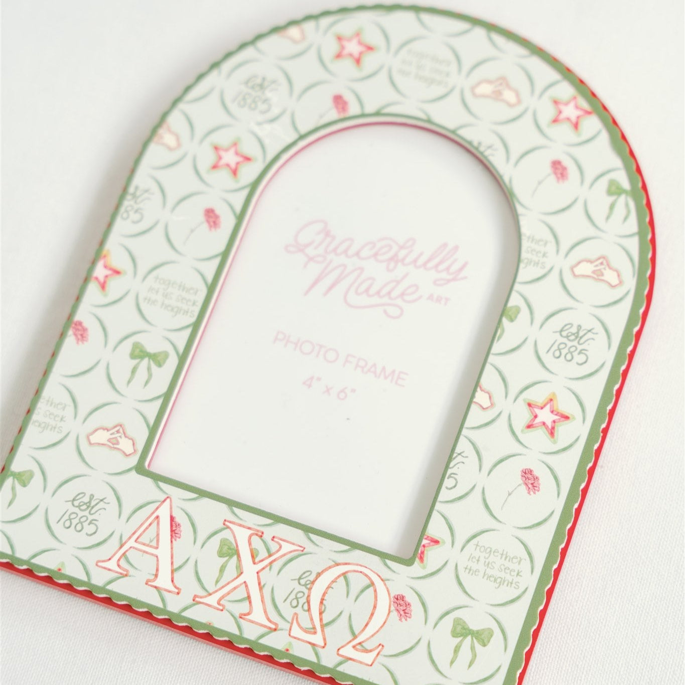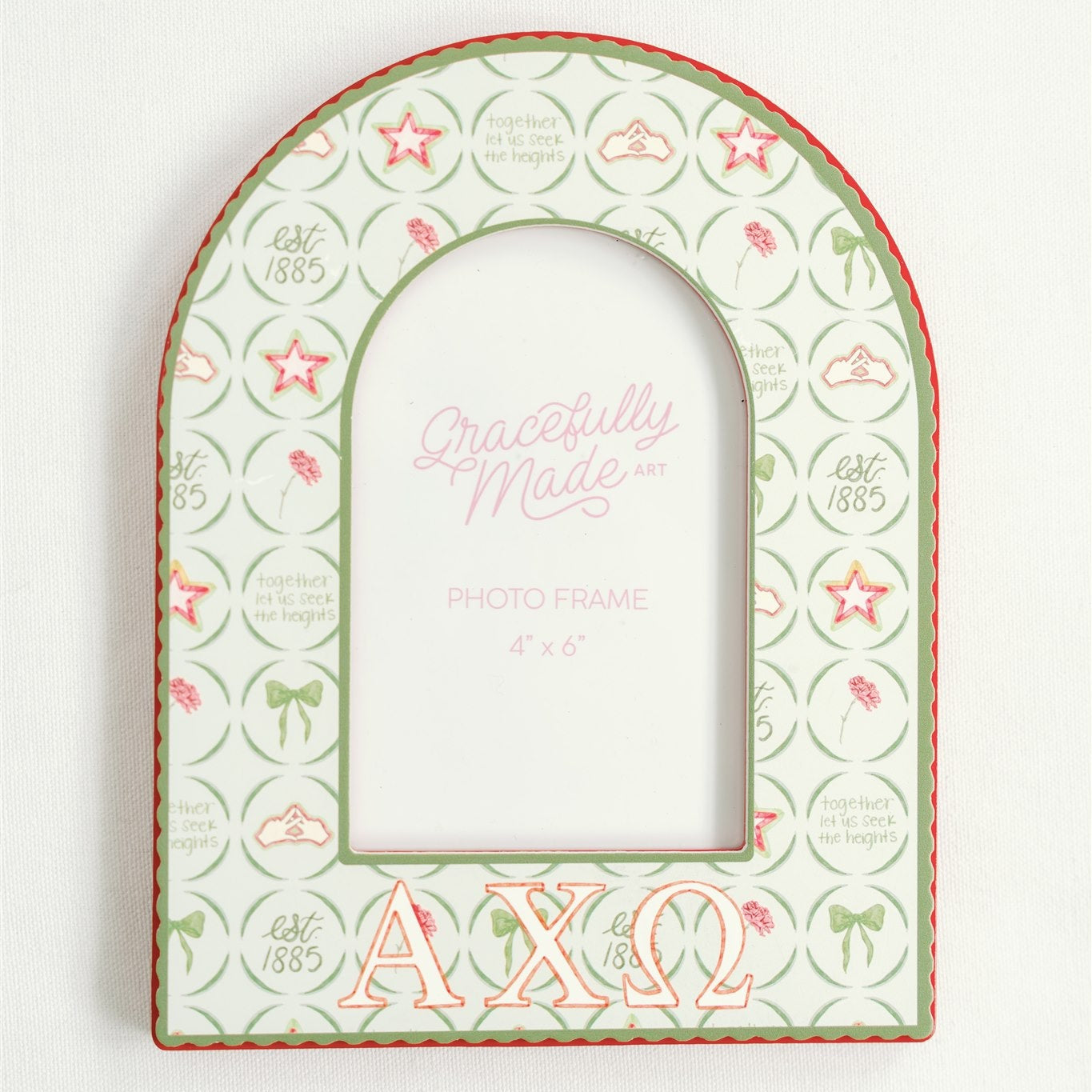 Show off your favorite memories with this fun and meaningful Alpha Chi Omega picture frame! Decorated with the sorority’s colors, symbols, and phrases like “Together let us seek the heights,” it’s a sweet way to celebrate sisterhood. Whether you're gifting it or keeping it for yourself, it’s the perfect touch for any space.