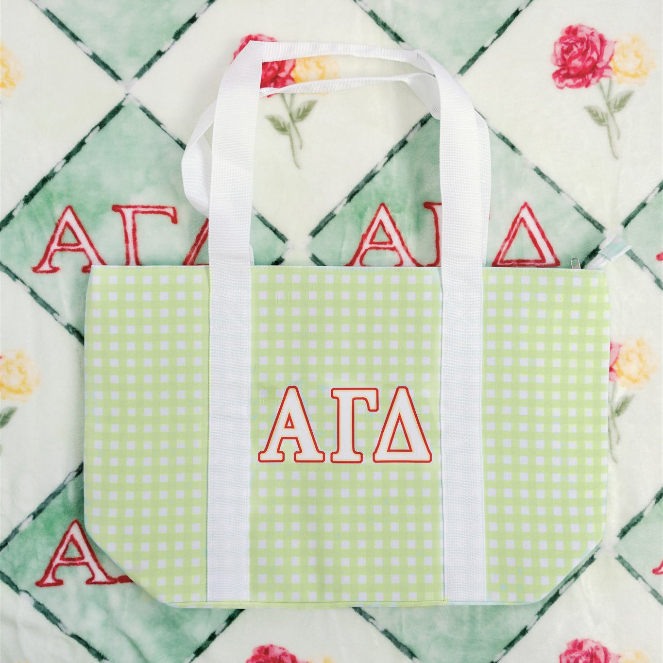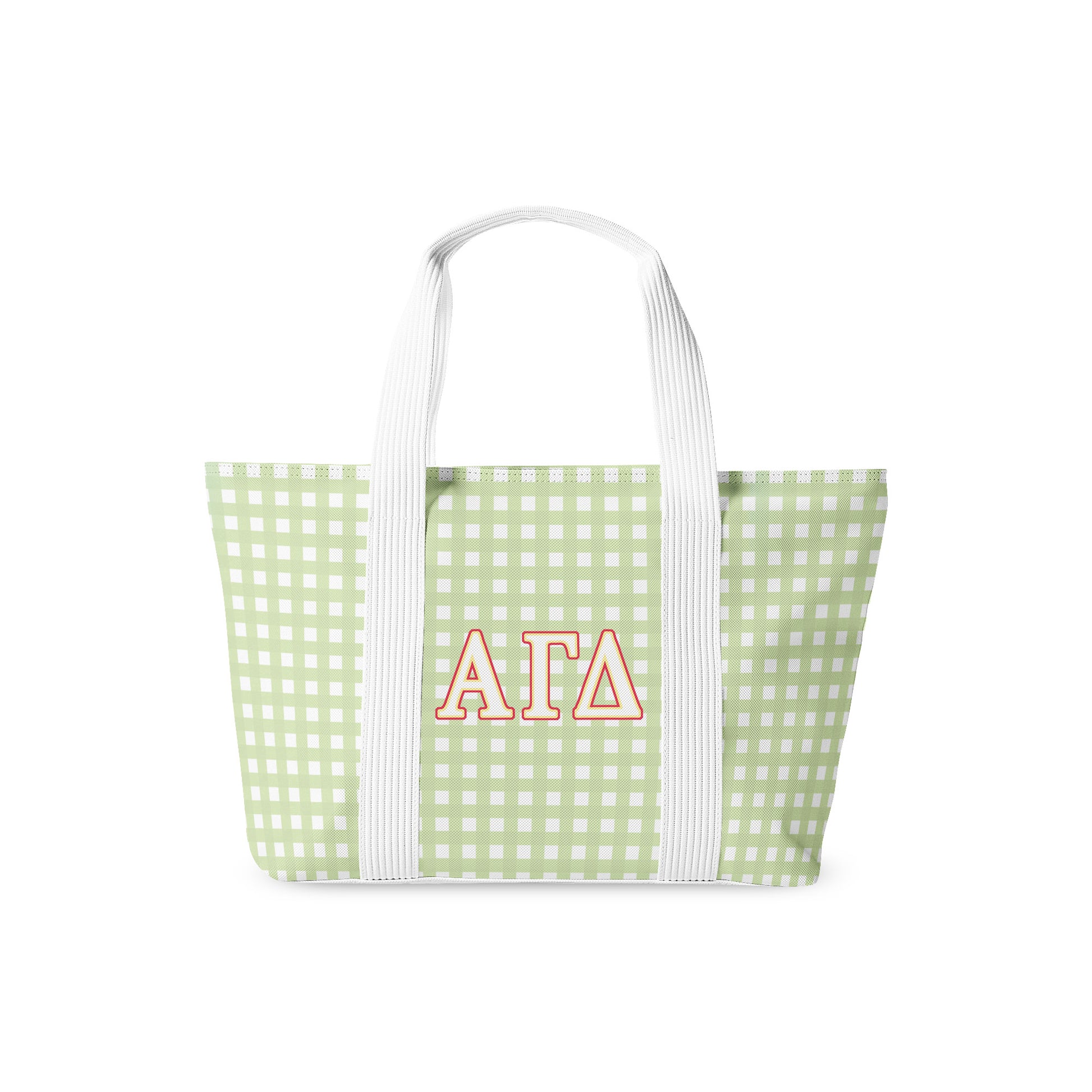 Our Alpha Gamma Delta tote bag is the perfect blend of cute and functional! Featuring a fresh green gingham pattern and bold embroidered Greek letters, this spacious tote is ideal for campus days, beach trips, or weekend getaways. It includes three interior pockets to help keep your essentials organized on the go.