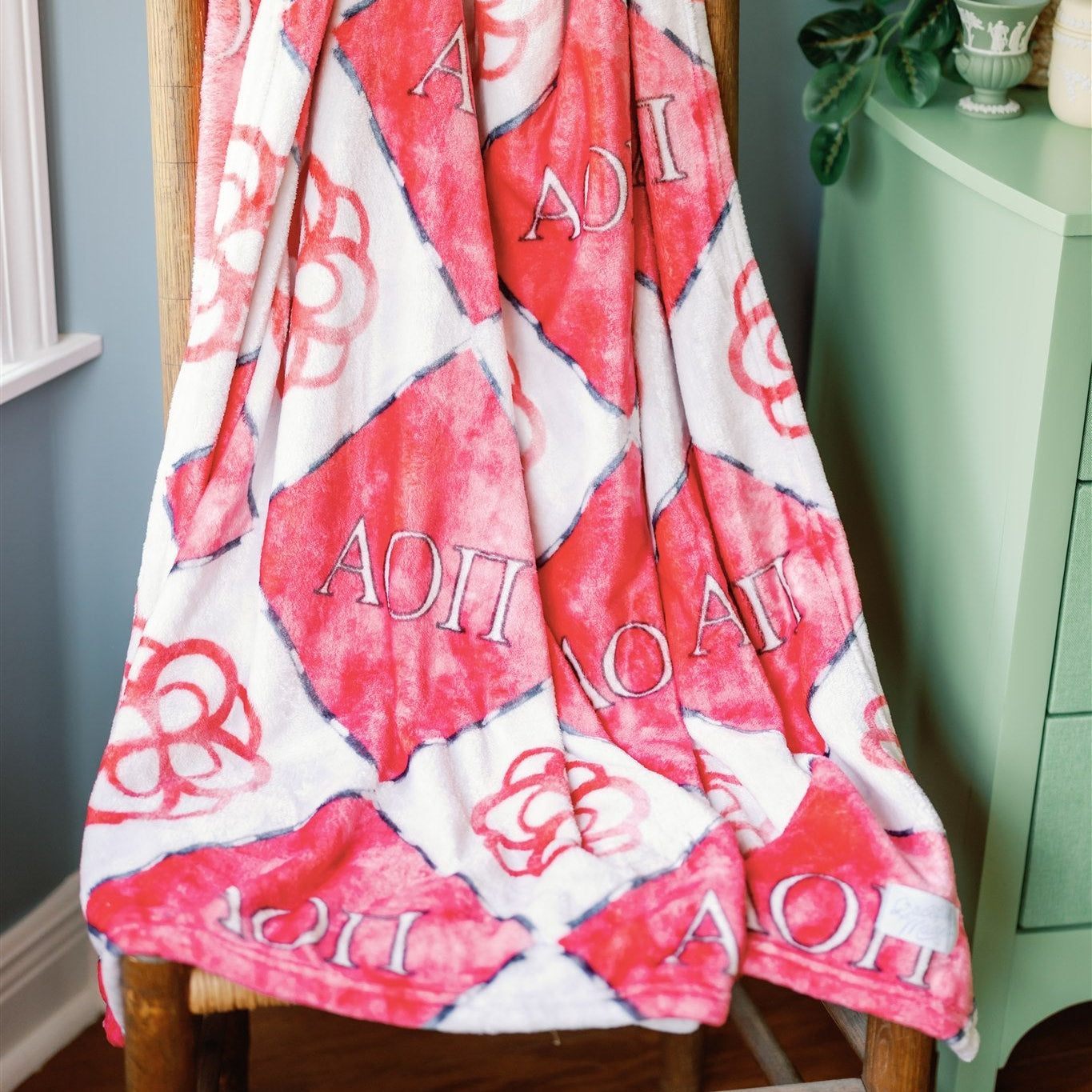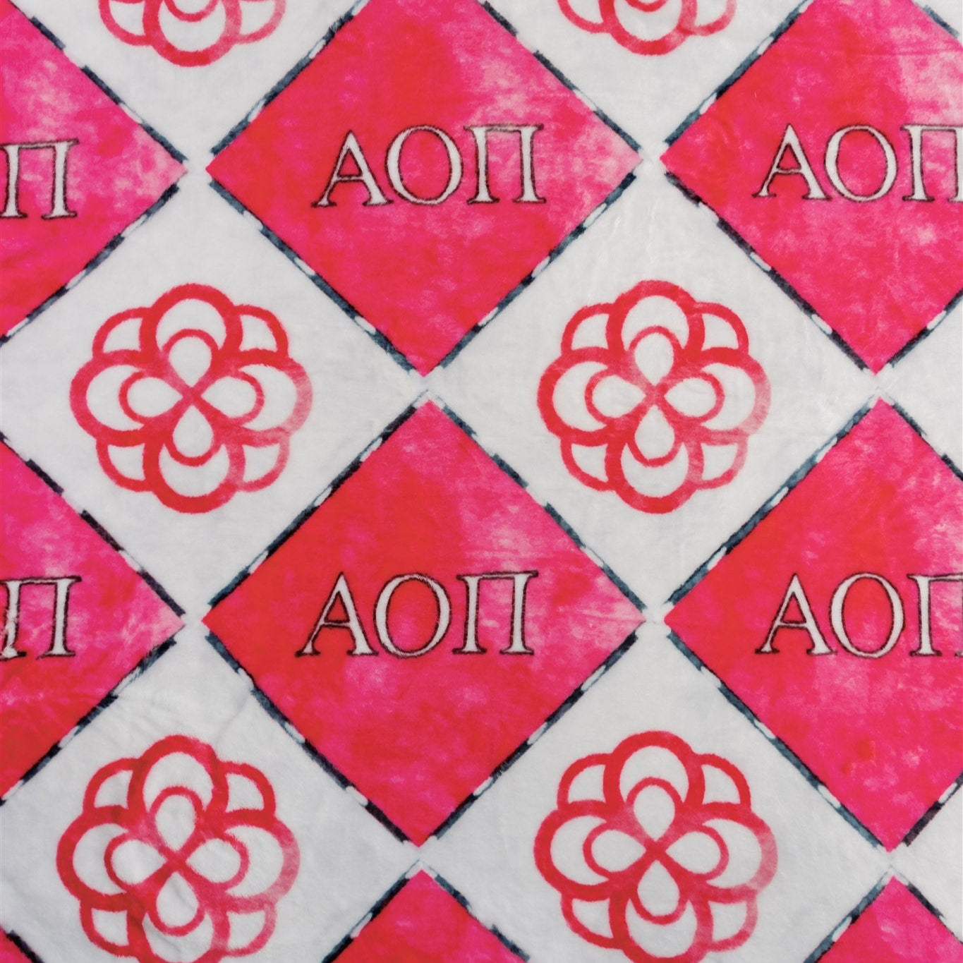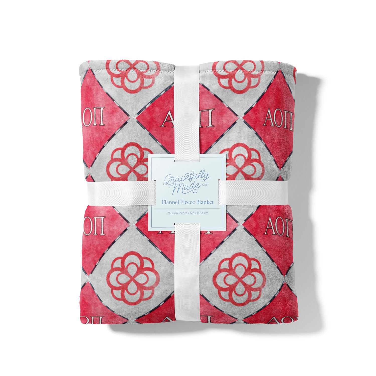 Cozy up in Alpha Omicron Pi style with our AOII fleece blanket! This 50x60 inch throw features a hand-painted diamond pattern in bold crimson and silver tones, showcasing the AOII infinity rose and Greek letters. It’s soft, stylish, and perfect for gifting, dorm décor, or celebrating sisterhood year-round.