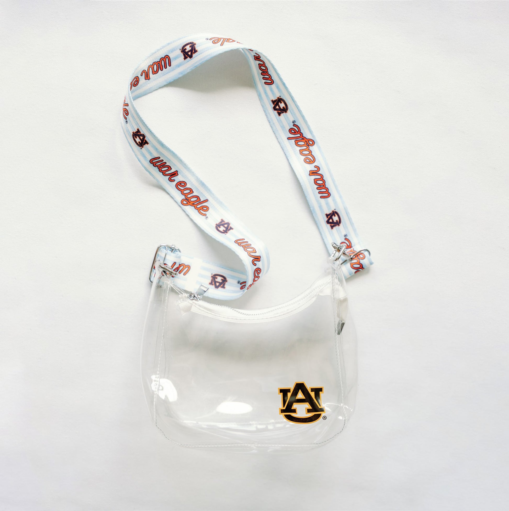 The clear stadium bags include an adjustable light blue watercolor strap.