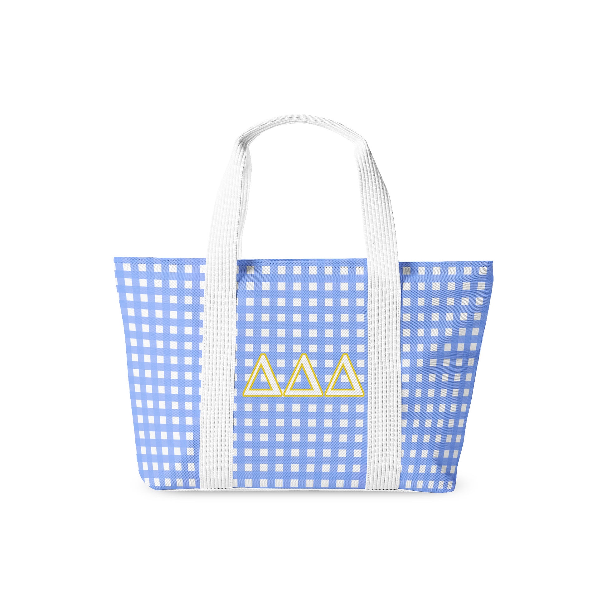 This officially licensed Tri Delta tote bag is both stylish and functional — perfect for campus days, sorority events, or weekend trips. The design features a light blue gingham pattern with the iconic yellow Tri Delta triangles on the front, giving it a fresh, collegiate look. Made from durable canvas with sturdy white straps and a cheerful yellow interior, it’s roomy enough for all your essentials while still keeping that polished, preppy aesthetic Tri Delta girls love