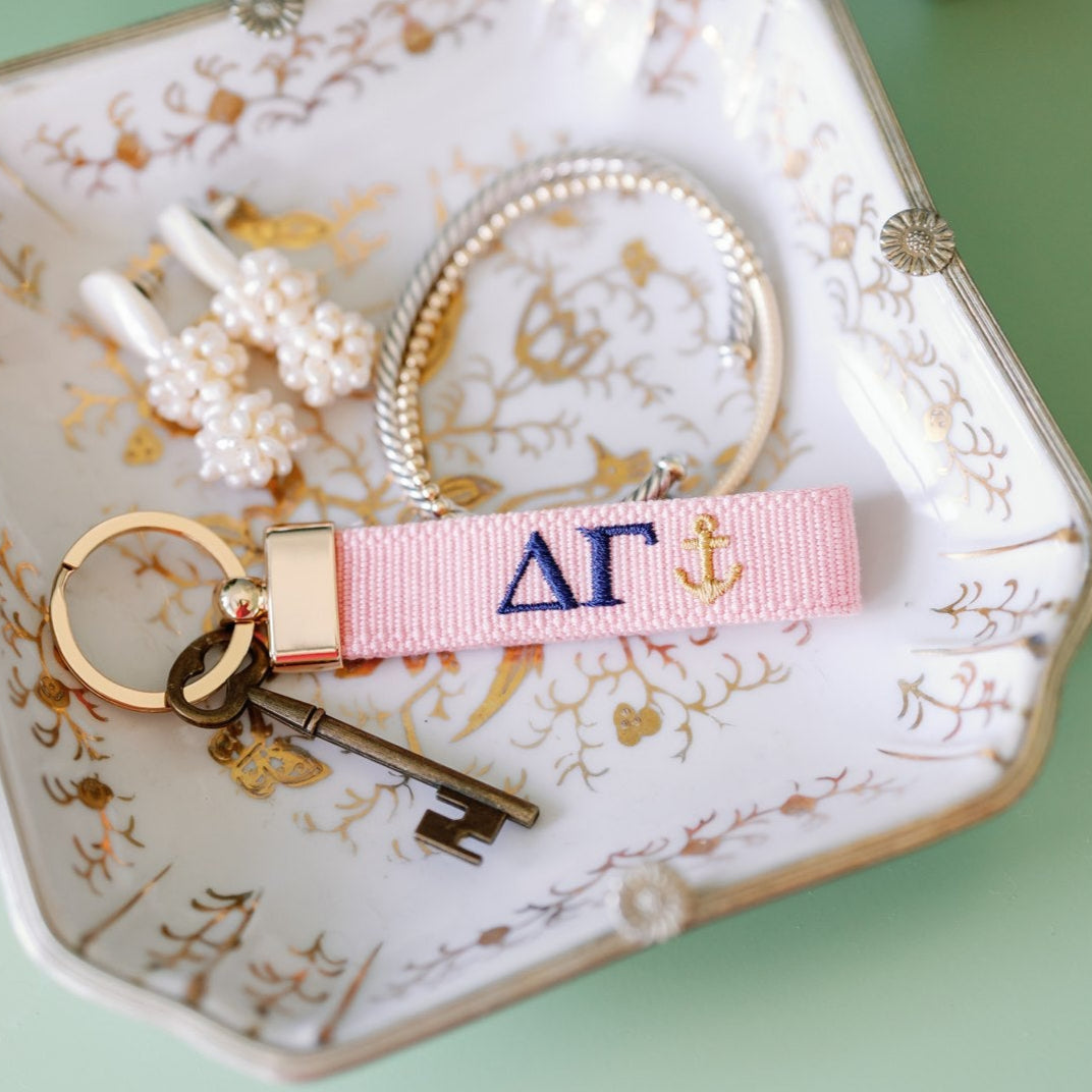 This Delta Gamma Keychain is a charming, double-sided accessory that adds a touch of elegance to your keys or bag. On one side, you'll find the iconic sorority letters, embroidered in white and paired with a delicate anchor. The other side features the sorority name in a graceful script. Crafted with gold hardware for a polished finish, this keychain offers both style and functionality. Perfect for an sister, it's a thoughtful way to showcase your sorority pride every day.
