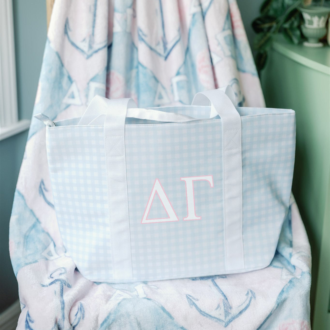 Our Delta Gamma tote bag is the perfect everyday carryall for any DG girl! The soft blue gingham pattern and delicate pink embroidered letters make it effortlessly cute and classic. With three interior pockets, this tote keeps your essentials organized whether you're headed to class, the beach, or a weekend trip.