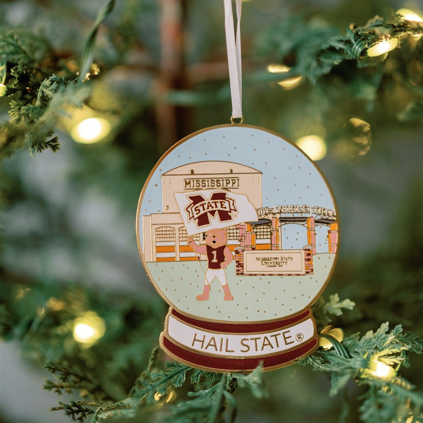 Our Mississippi State University Enamel Ornament is a charming tribute to Bulldog pride. Featuring Bully the mascot proudly waving the MSU flag in front of Davis Wade Stadium and the famous university entrance, this detailed design captures the energy and tradition of Starkville. Finished with shimmering enamel and gold accents, it’s a timeless keepsake for every Bulldog fan. The base reads “Hail State®”, making it the perfect ornament to celebrate your love for Mississippi State year after year.