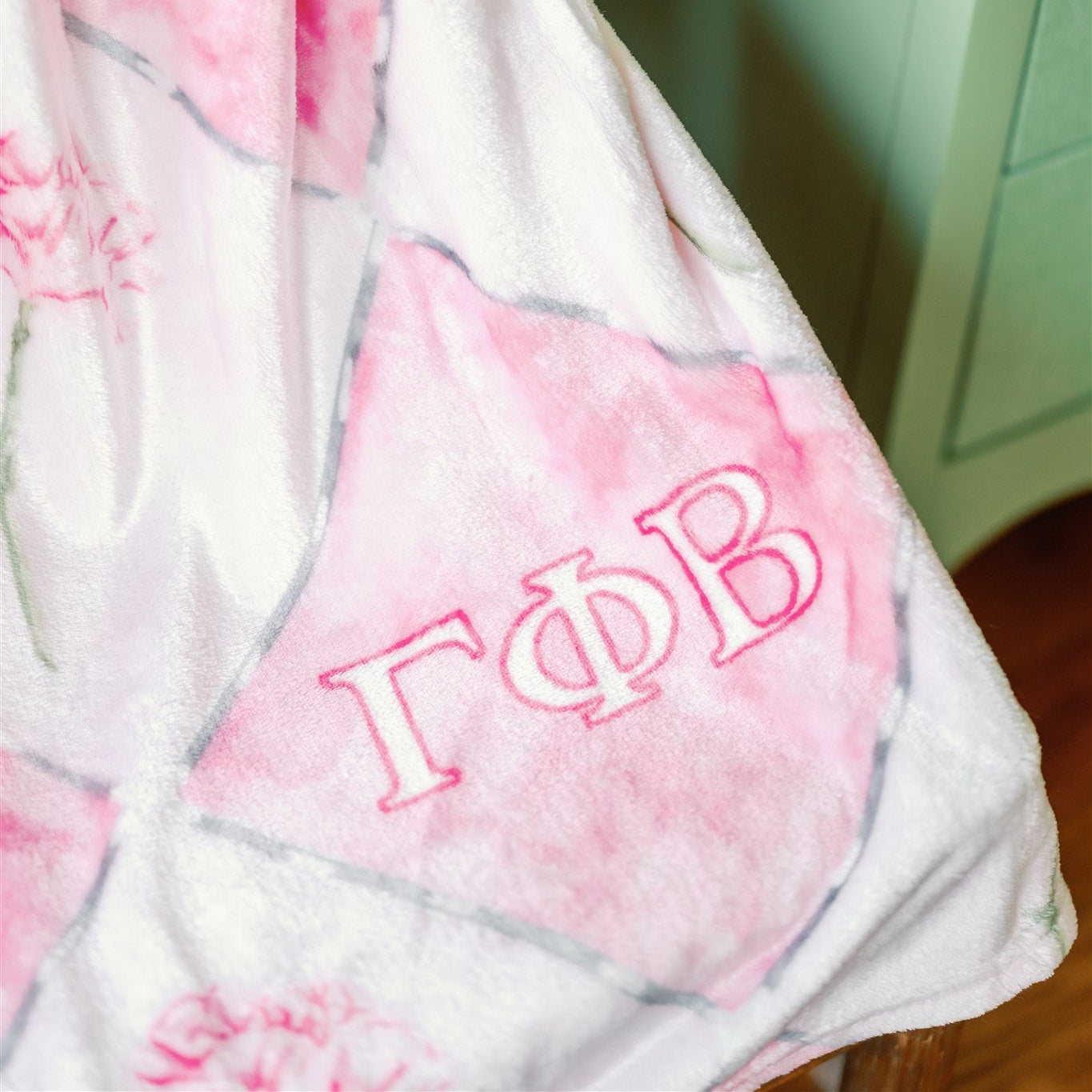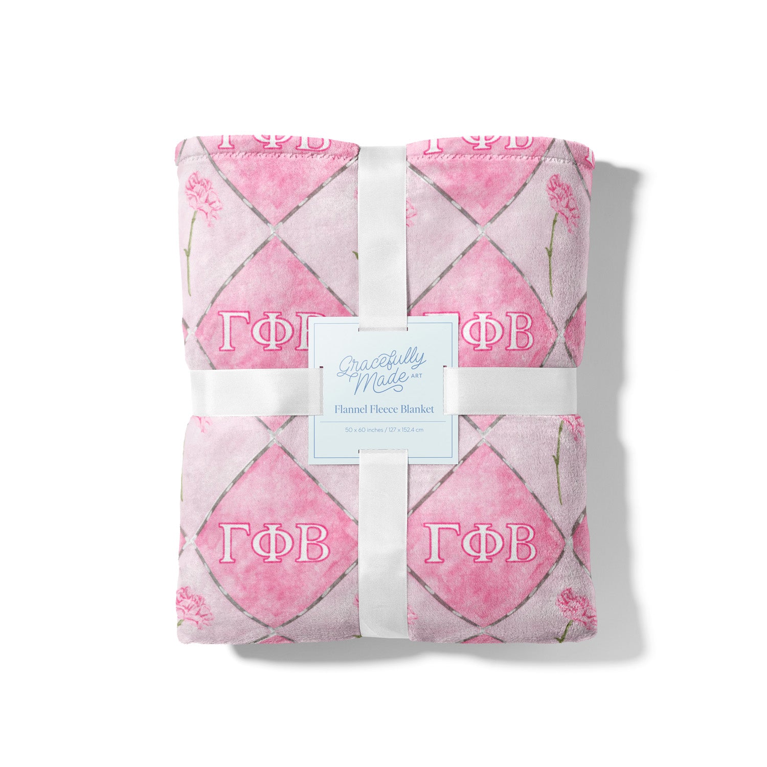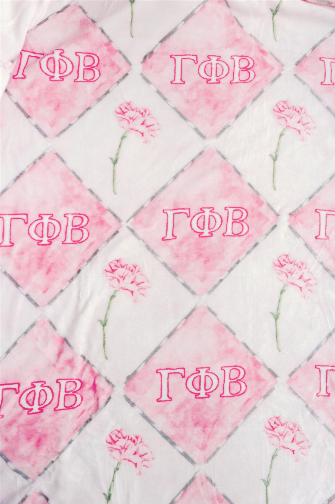 Wrap yourself in warmth and sisterhood with our Gamma Phi Beta fleece blanket! This 50x60 inch throw features a soft pink watercolor diamond pattern adorned with delicate carnations and the Gamma Phi letters. It’s the perfect cozy companion for dorm rooms, Bid Day baskets, or thoughtful gifts for your favorite Gamma Phi.