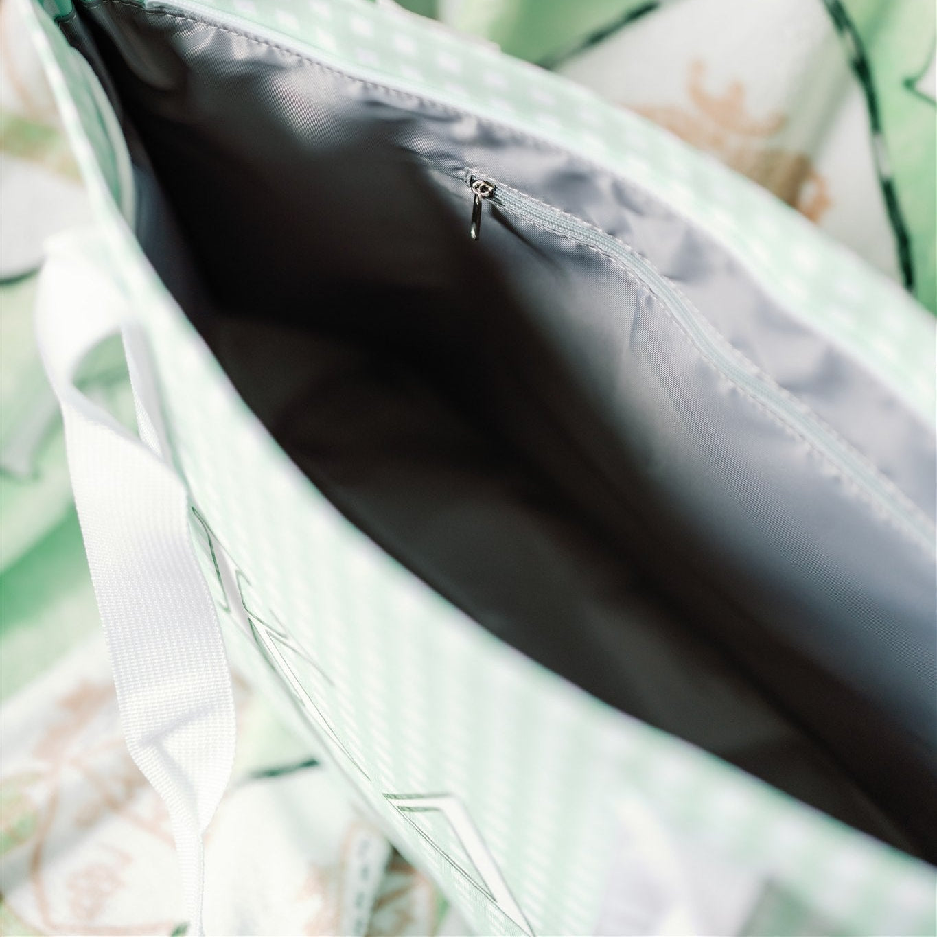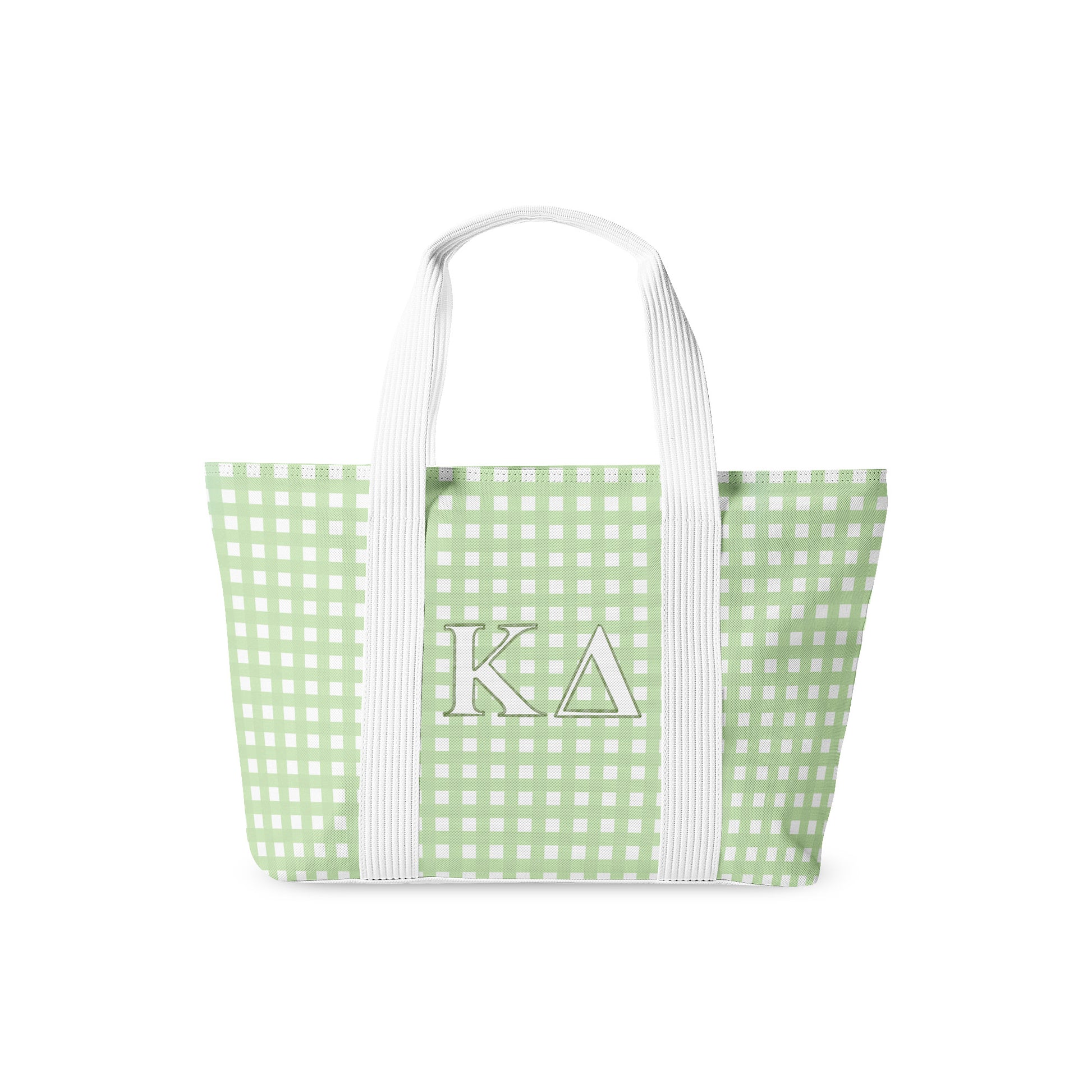 This officially licensed Kappa Delta tote bag is the perfect mix of classic and chic. Featuring a soft mint green gingham pattern with the elegant KD Greek letters embroidered in sage green, this bag captures the timeless Kappa Delta aesthetic. The sturdy white straps and sophisticated grey interior make it as practical as it is stylish — ideal for carrying essentials to class, chapter meetings, or weekend getaways.