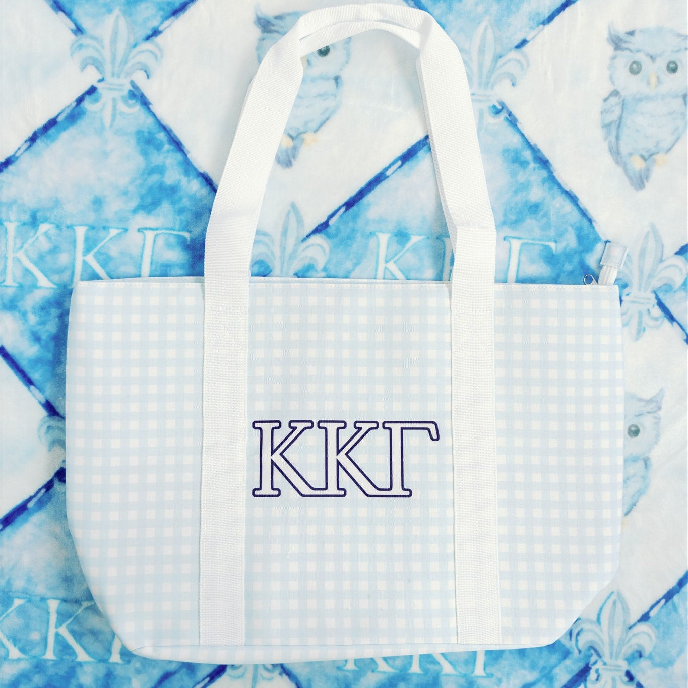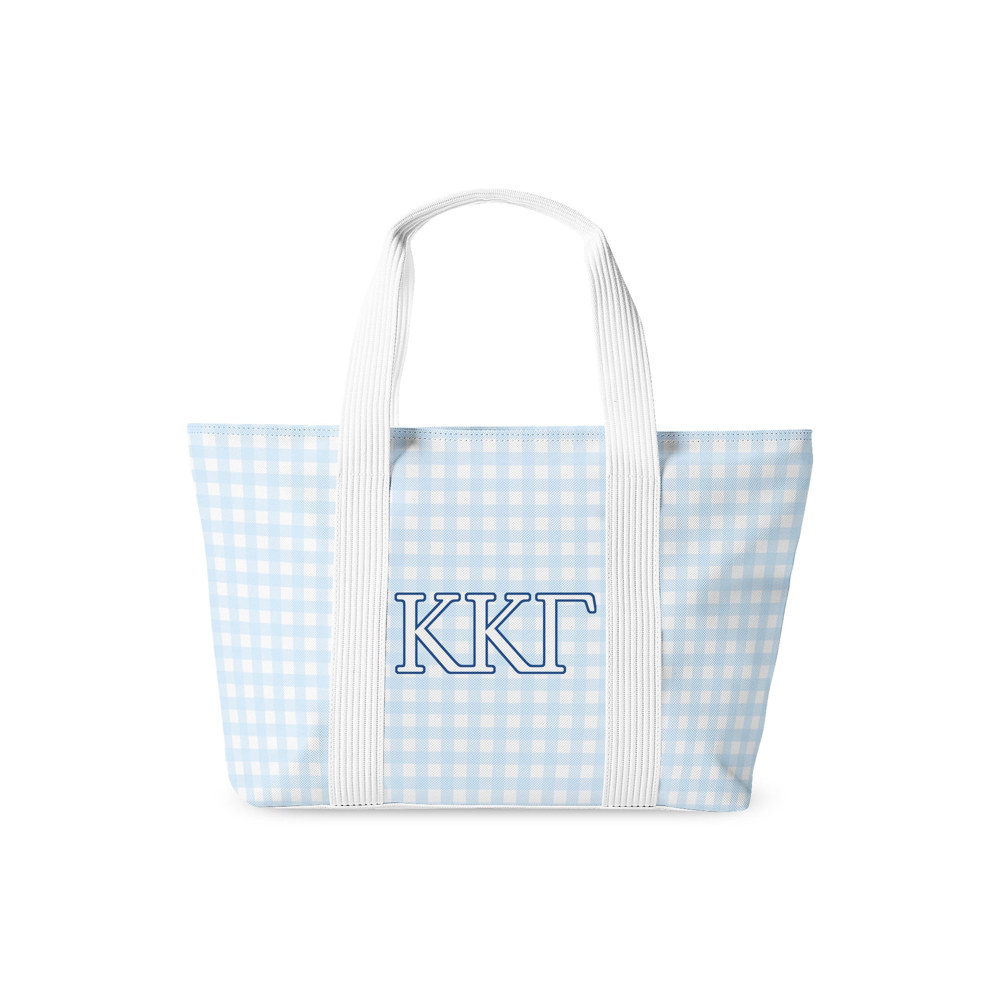 Our Kappa Kappa Gamma tote bag is the perfect mix of timeless and trendy. Featuring a light blue gingham print and crisp embroidered Greek letters, this bag makes a sweet statement wherever you go. With three interior pockets, it’s designed to keep your essentials organized—whether you're heading to class, brunch, or a sisterhood event.
