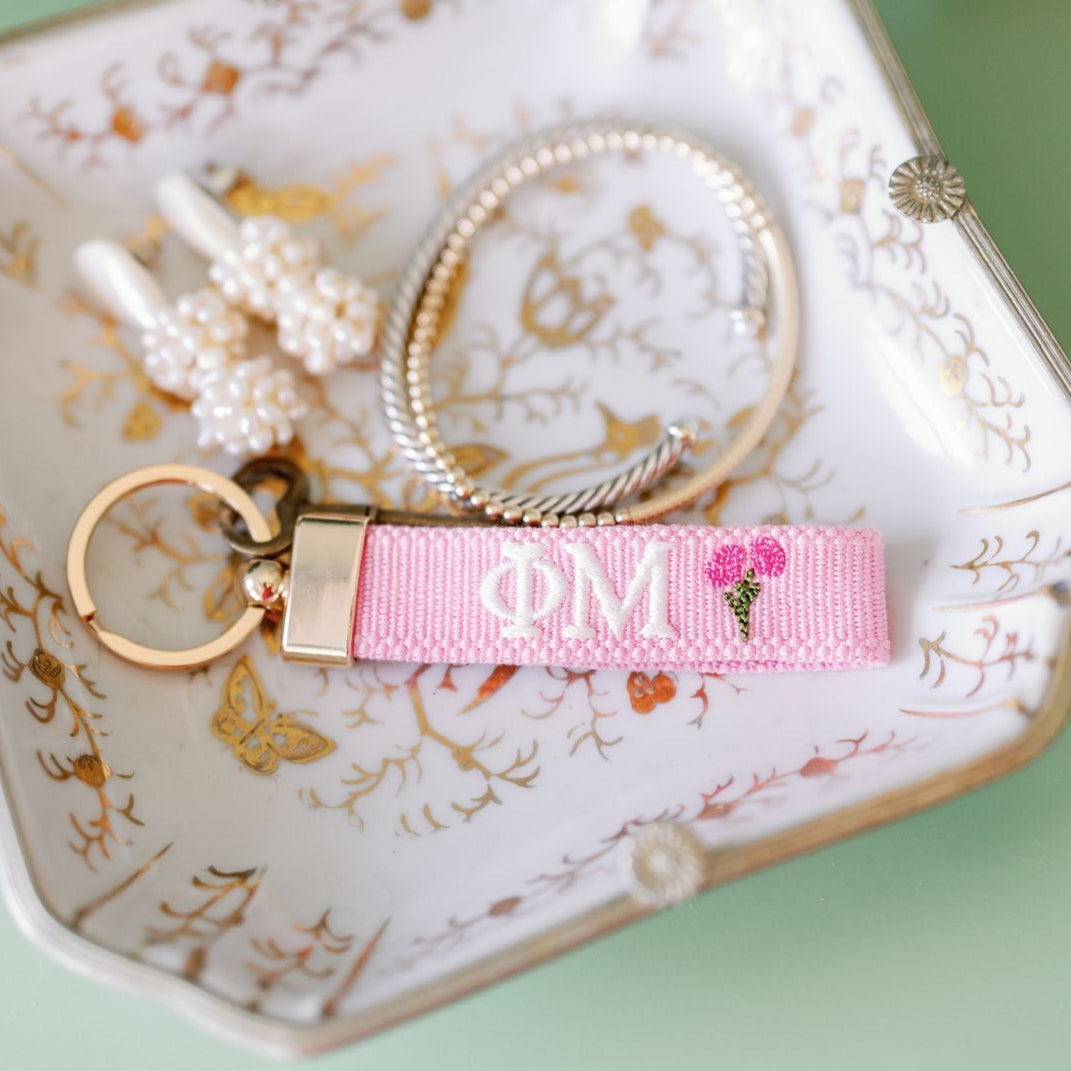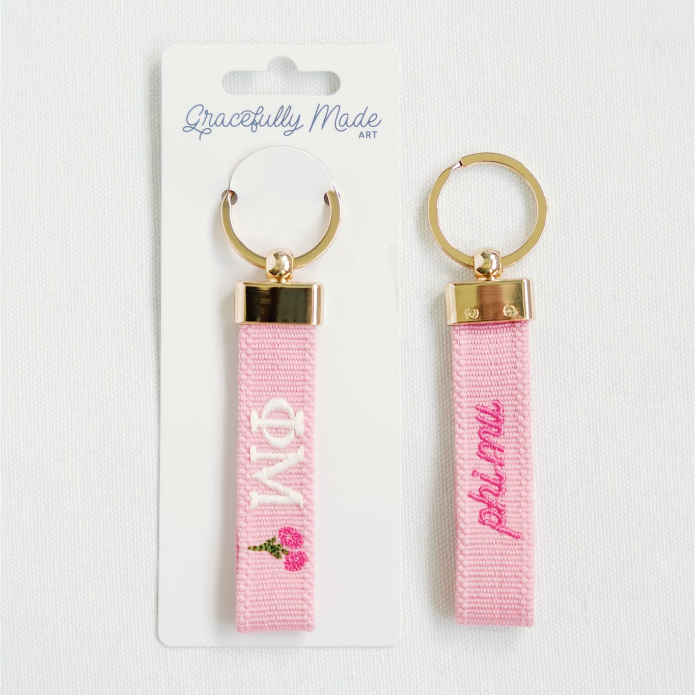This Phi Mu Keychain is a charming, double-sided accessory that adds a touch of elegance to your keys or bag. On one side, you'll find the iconic sorority letters, embroidered in white and paired with a delicate rose-colored carnation, symbolizing the beauty and strength of Phi Mu. The other side features the sorority name in a graceful script. Crafted with gold hardware for a polished finish, this keychain offers both style and functionality. Perfect for any Phi Mu sister, it's a thoughtful way to showcase your sorority pride every day.