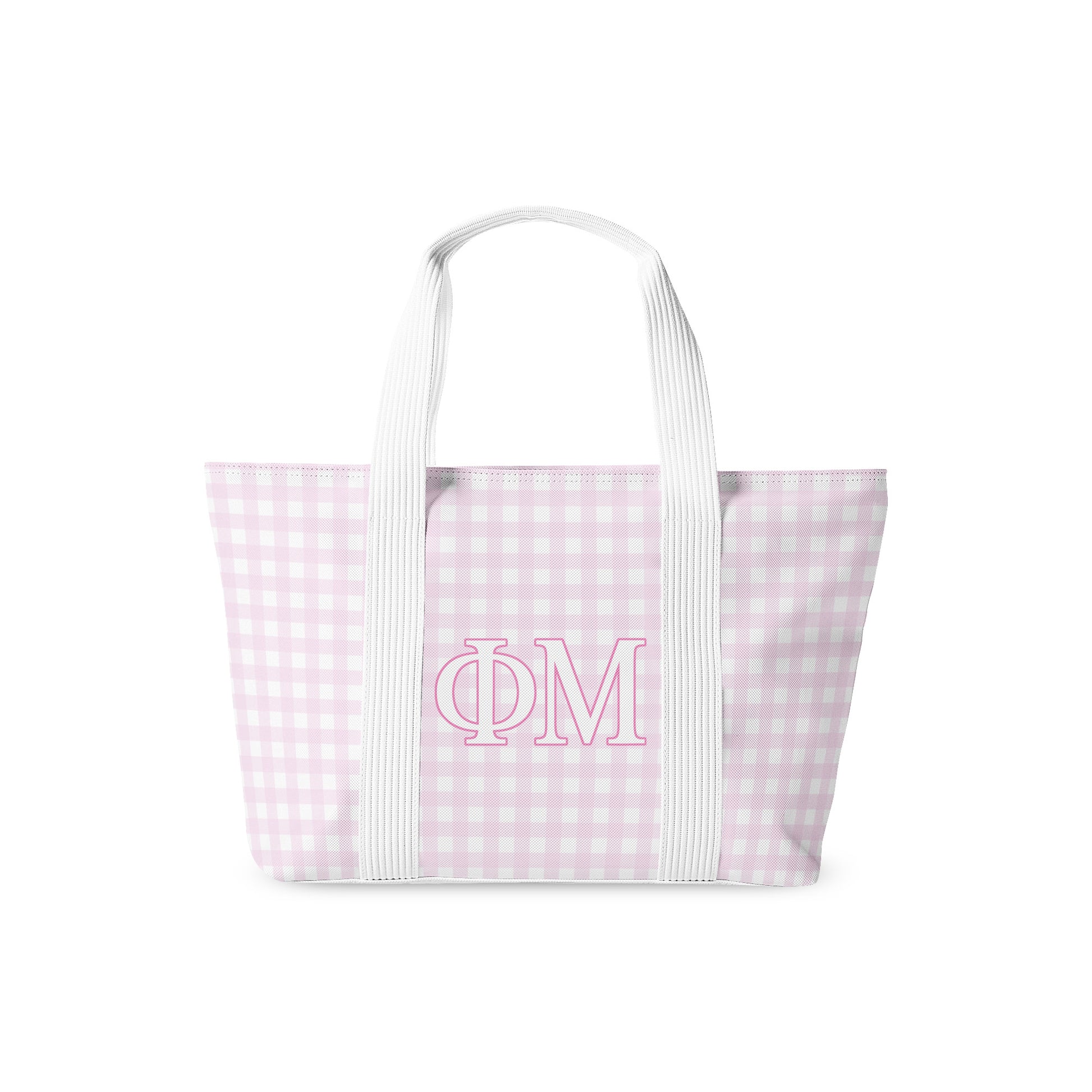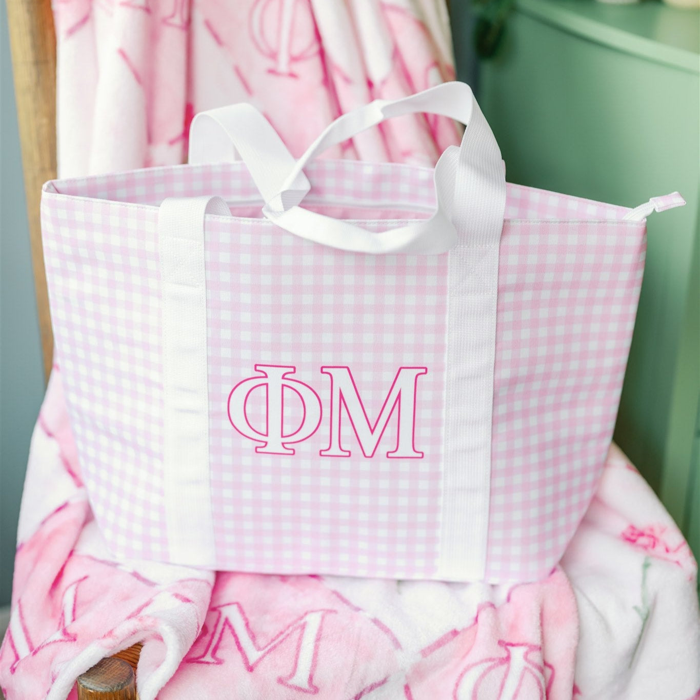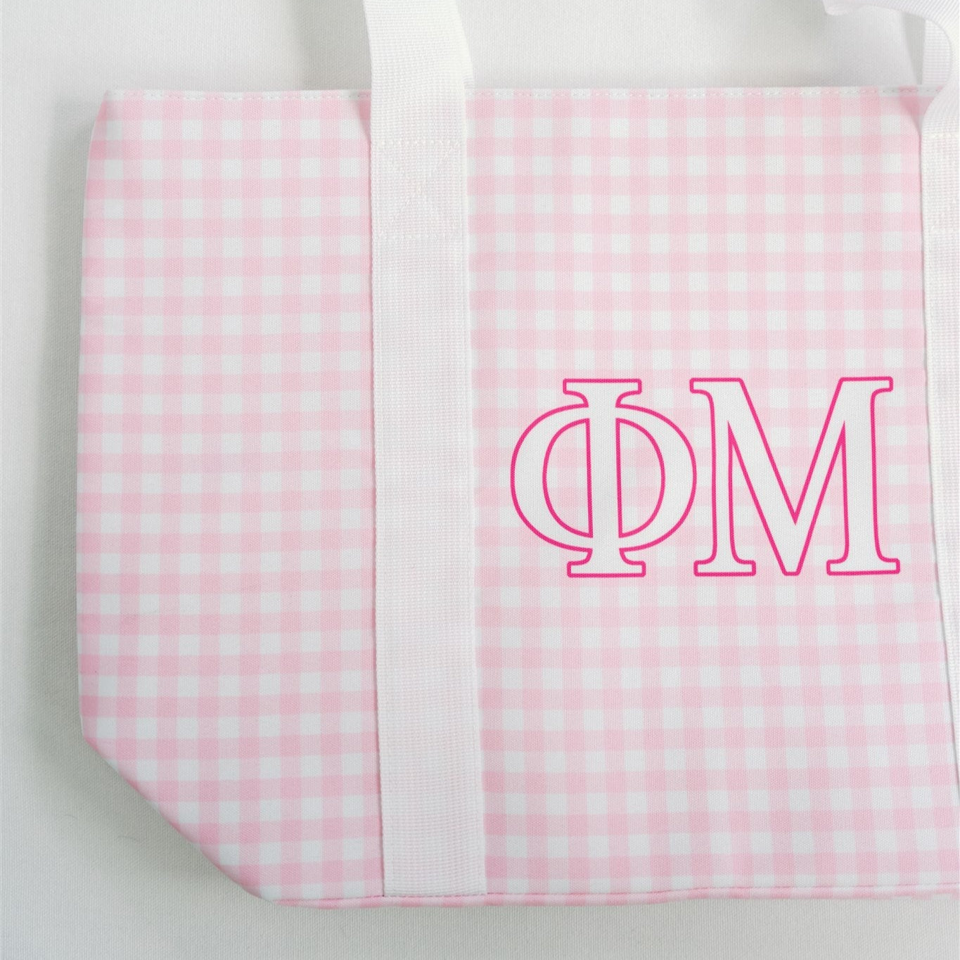Our Phi Mu tote bag is a sweet and stylish staple for any member of the sisterhood! Featuring a light pink gingham print and vibrant embroidered Greek letters, it’s perfect for adding a pop of sorority pride to your day. With three interior pockets, this tote is both cute and practical—ideal for everything from class to weekend adventures.
