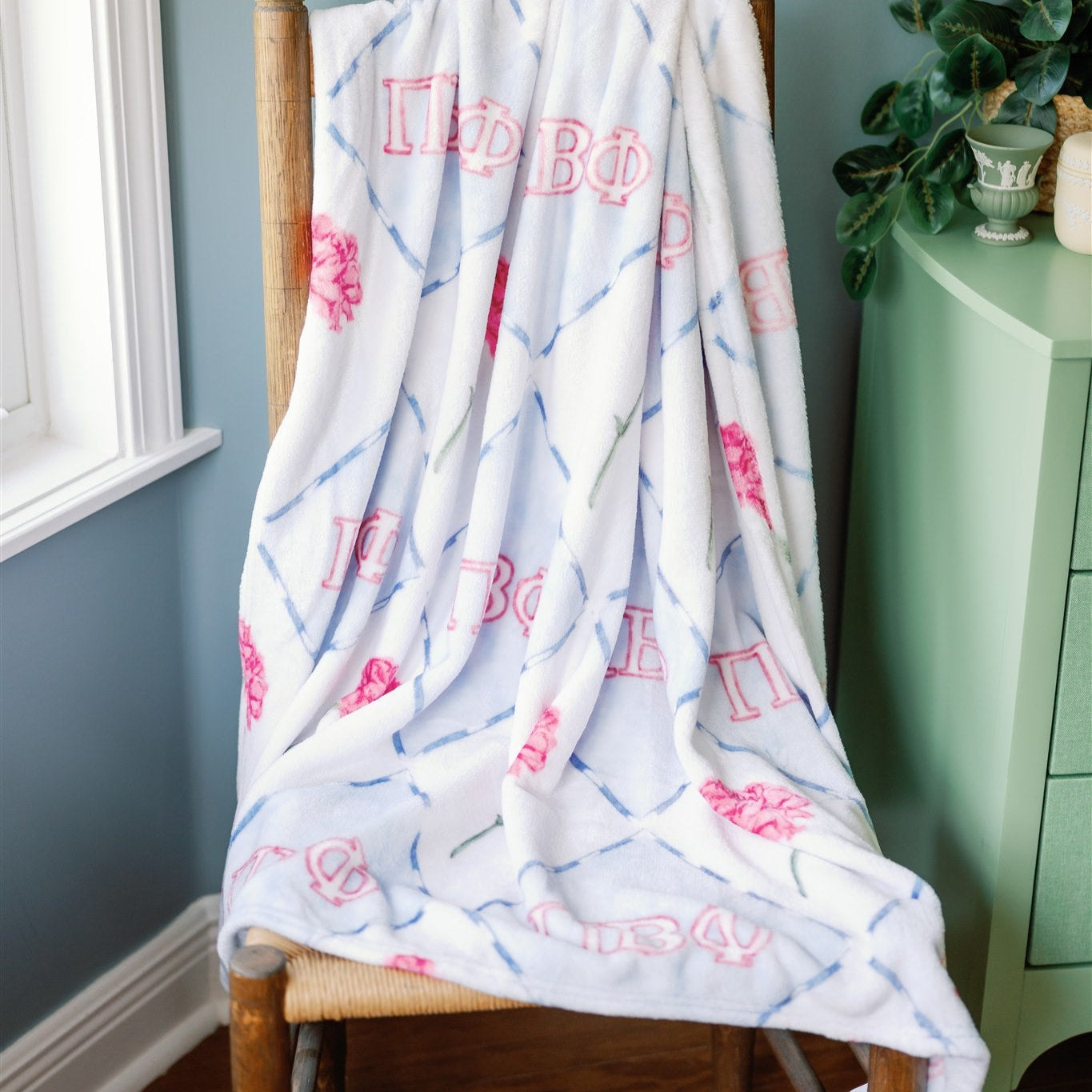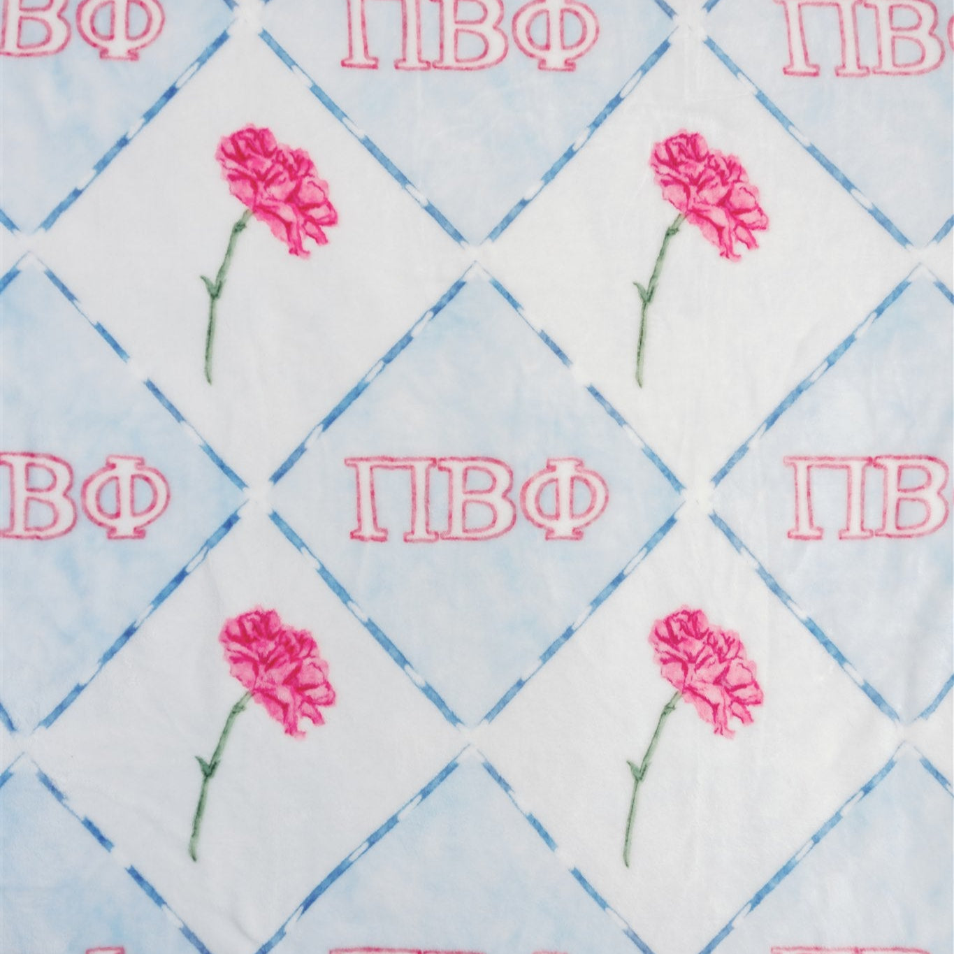 Wrap yourself in Pi Phi pride with our Pi Beta Phi fleece blanket! This 50x60 inch throw features a soft watercolor diamond pattern in blue and white, adorned with classic pink carnations and the Pi Beta Phi Greek letters. It's a cozy and beautiful way to celebrate sisterhood—perfect for dorms, Bid Day, or thoughtful gifts for your angel sisters.