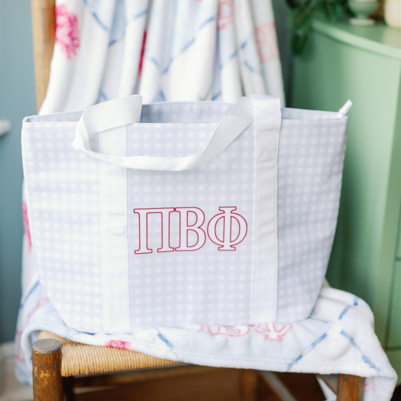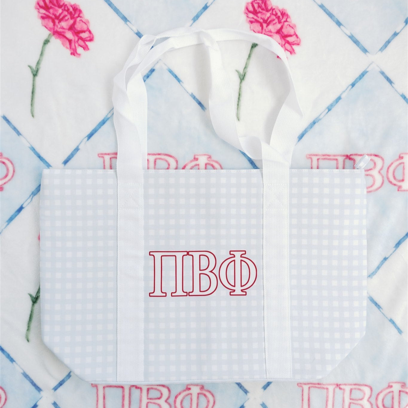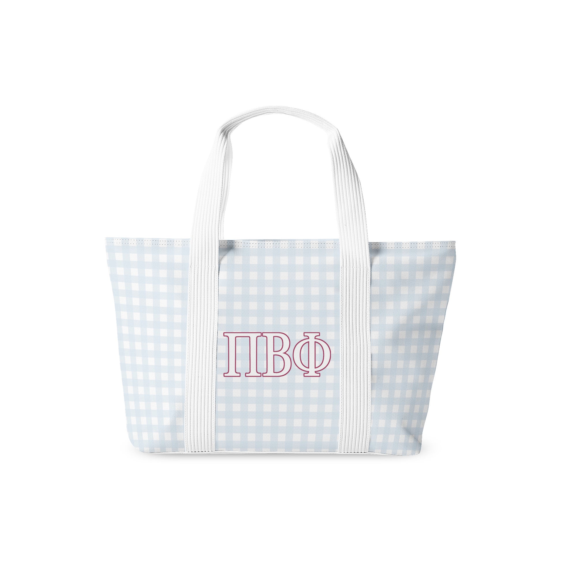 Our Pi Beta Phi tote bag is the perfect mix of classic charm and sorority spirit. Featuring a soft blue gingham pattern and eye-catching pink embroidered Greek letters, this bag is as cute as it is practical. With three interior pockets, it’s ideal for staying organized whether you're running errands, headed to chapter events, or packing for a weekend getaway.