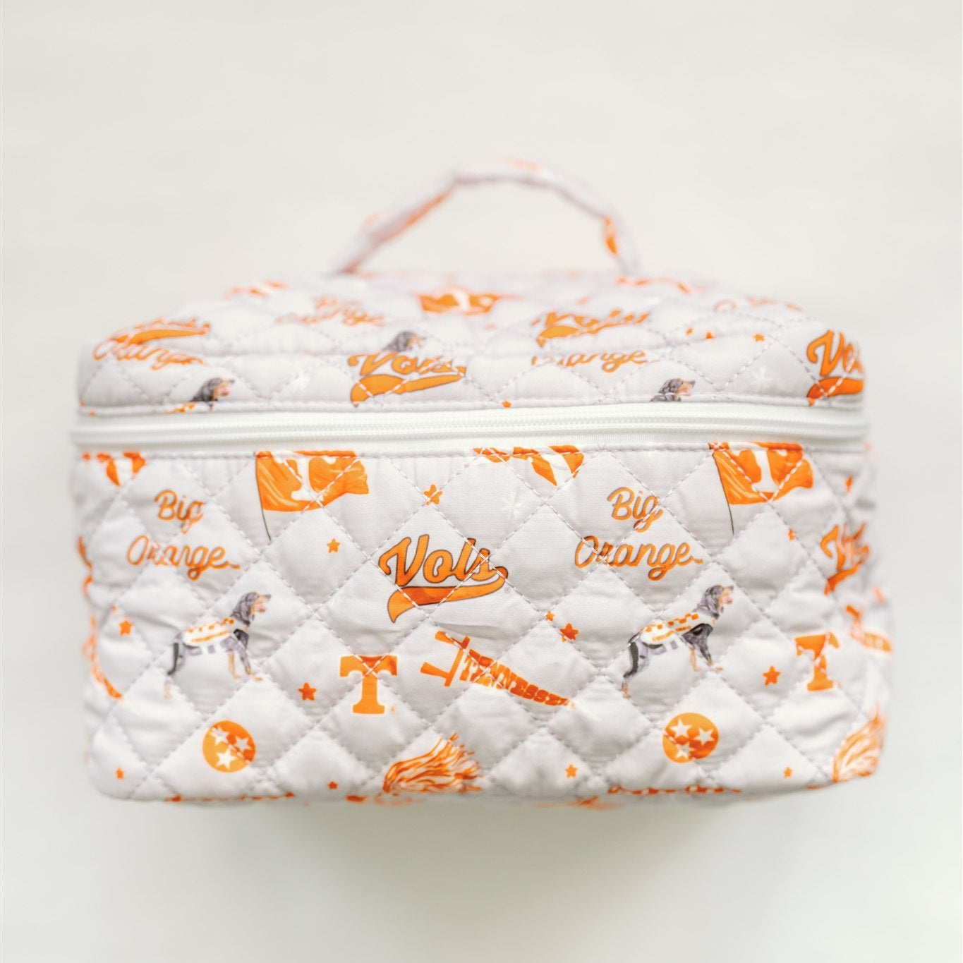This 10x7x6 inch make up bag is perfect for Tennessee fans everywhere! The large toiletry bag features a handle on top and an inside pocket. The patter includes Smokey the dog to “Big Orange” details — in bold Tennessee orange. Complete with a sturdy top handle and smooth zip closure, it’s both practical and spirited, making it a must-have for Tennessee fans at home or on the go.