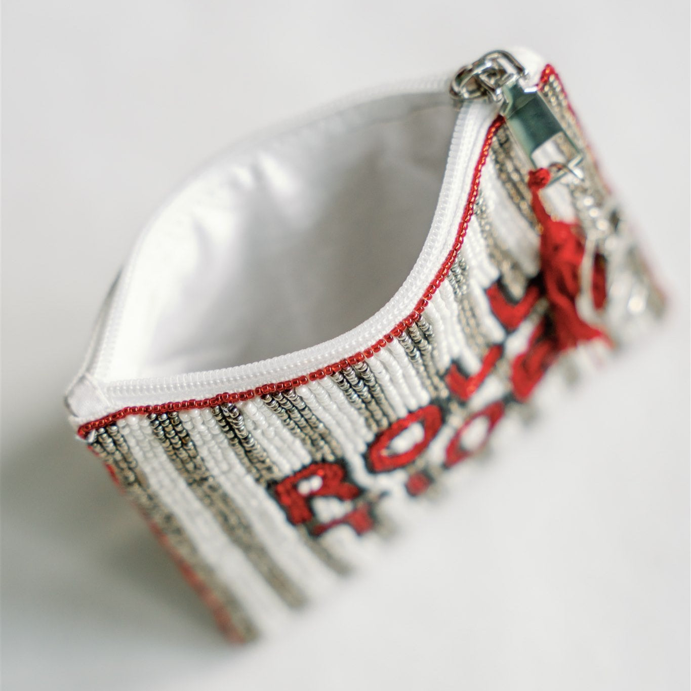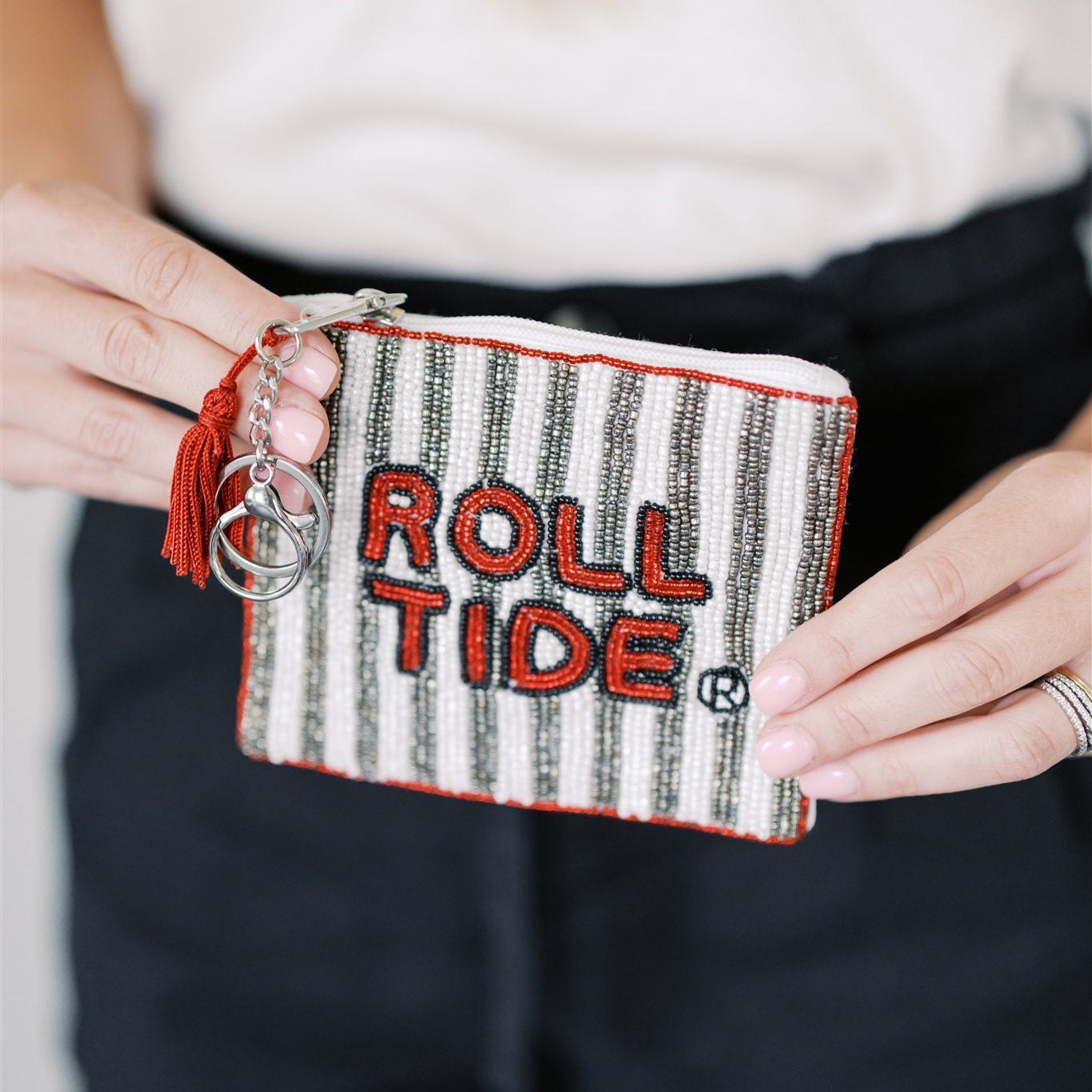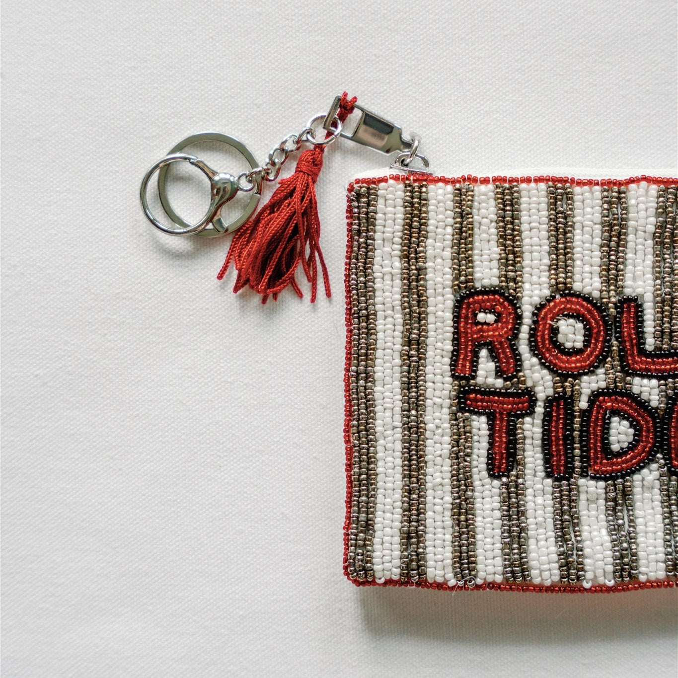 Show your team spirit with our beaded Alabama coin purse featuring bold “Roll Tide” lettering and classic crimson details. Perfect for game day, this compact accessory easily fits into your stadium-approved clear bag and keeps your essentials secure. The keyring and crimson tassel add the perfect touch of flair for any Alabama fan.
